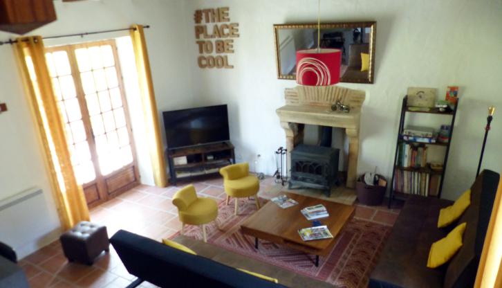 Salon/Salle à manger : 2 Canapés , écran plat 110 cm multimédia (peut être connecté à un smartphone ou une clé 4G), lecteur DVD, coin salon, poêle à bois, coin repas pour 8 personnes...