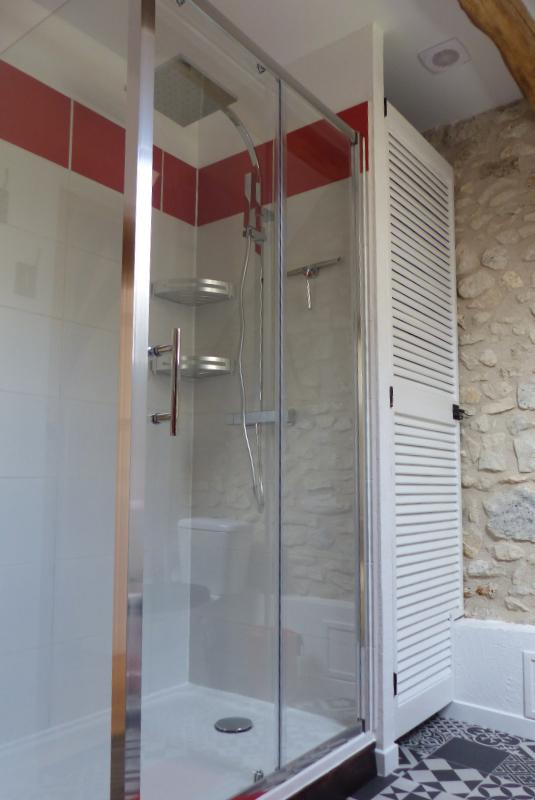 Salle d'eau : Grande douche à l'italienne, sèche-serviette, lave linge, sèche-cheveux, WC,