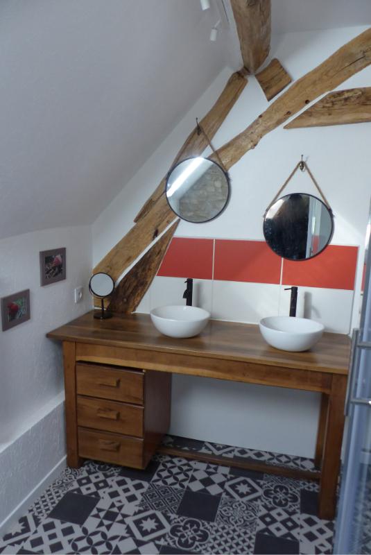 Salle d'eau : Douche XL, double vasque, sèche-serviette, sèche-cheveux, WC...
